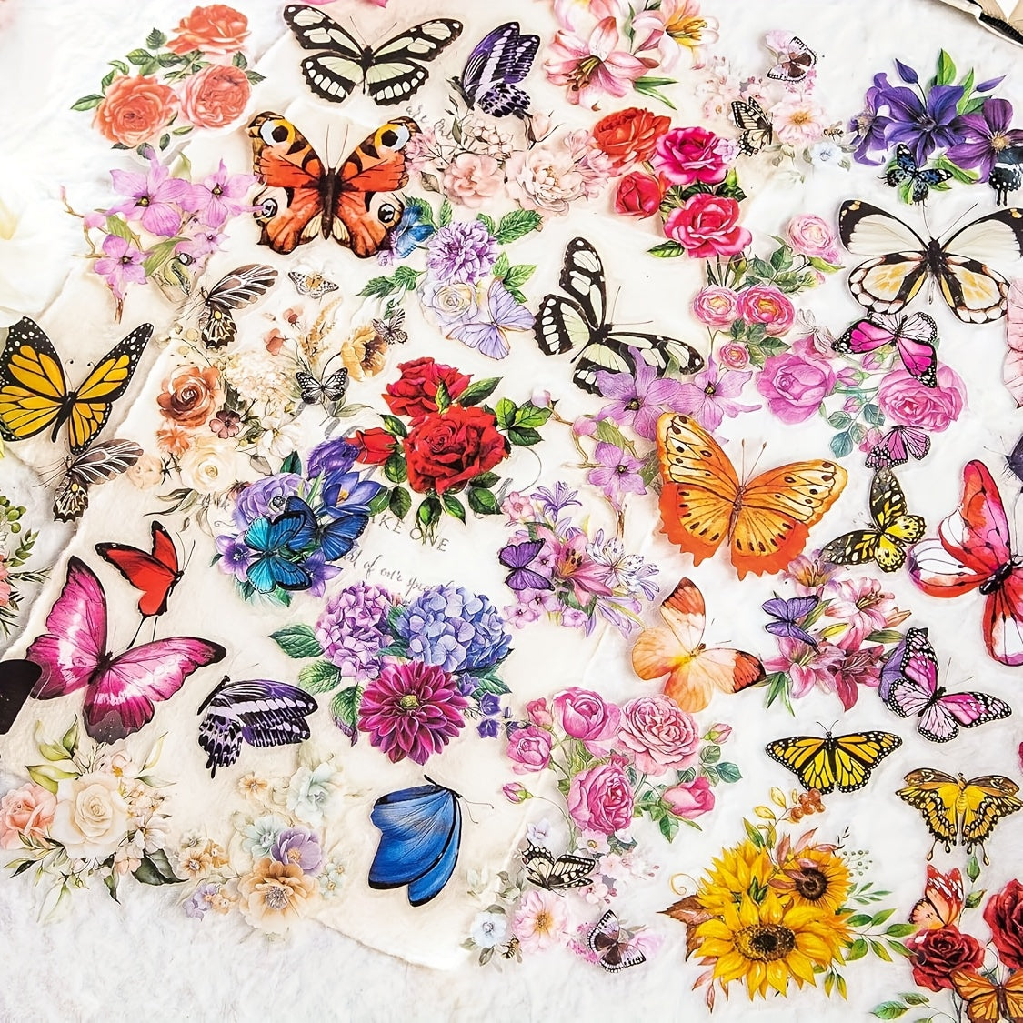 Tags: transparent stickers, PET butterfly stickers, floral decals, waterproof stickers, journaling supplies, scrapbooking stickers, DIY craft supplies, planner stickers, vintage floral decorations