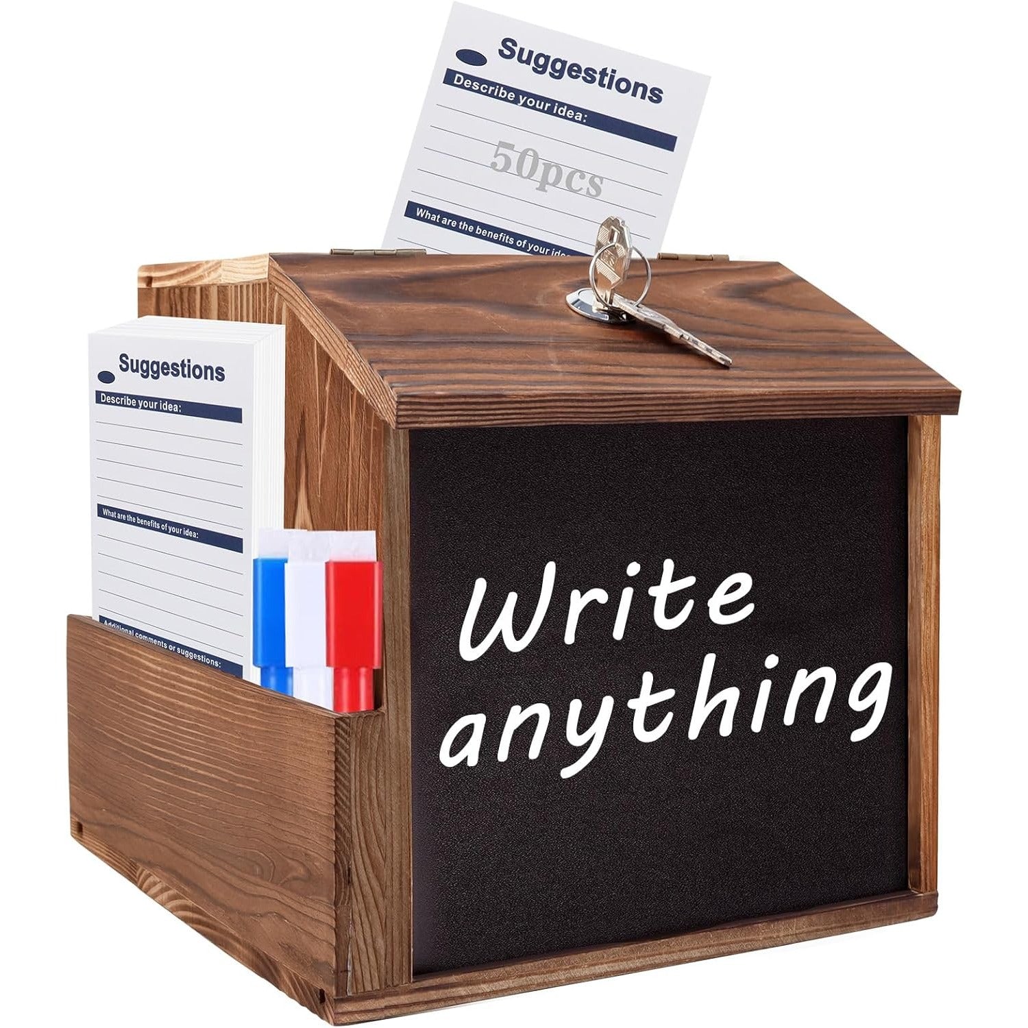 - Complete Package Includes: Wooden locking box with slot, 10 suggestion cards, removable chalkboard, 3 colored erasable chalk pens, 2 keys, mounting screws, and plastic anchors